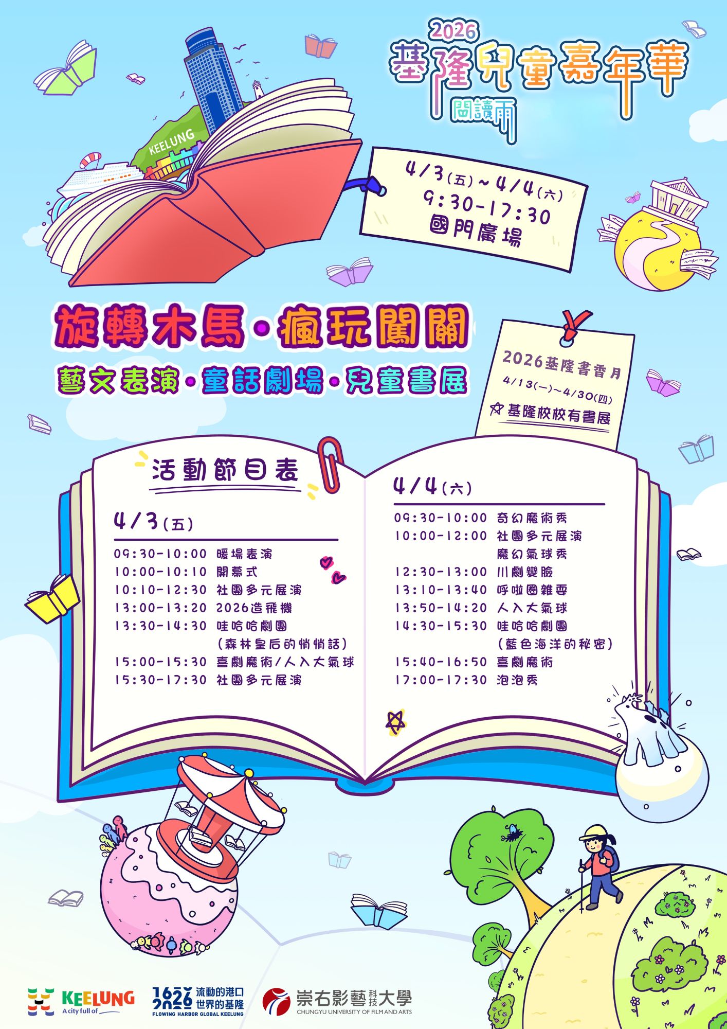 本次兒童節為了讓孩子透過多元體驗活動,本府展開4月3日與4日「2026基隆兒童嘉年華~閱讀雨」及4月13日至30日全市51校圖書館「2026基隆書香月」等系列活動。