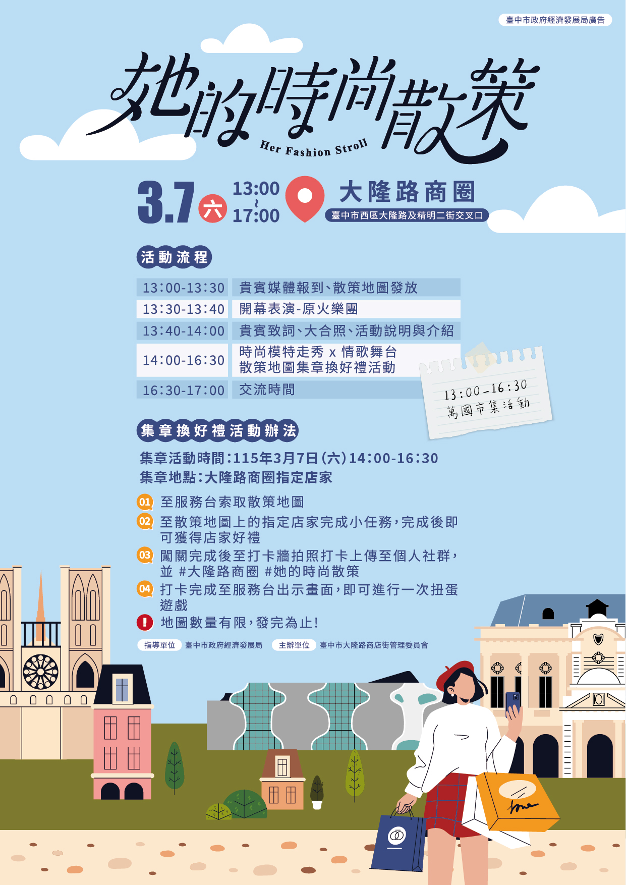 為推動台中商圈特色發展並展現城市多元風格生活,臺中市大隆路商圈將於 3月7日(六)13:30–16:30 舉辦主題活動 「她的時尚散策」,透過街區散步、風格店家探索、市集與集章活動,邀請民眾走入街區,發現城市裡的生活美學。