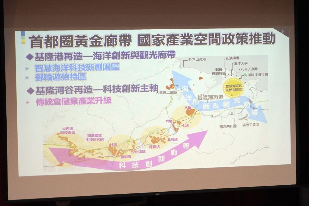 接著由基隆市政府都市發展處謝孝昆處長進行演講・他除了分享市府近幾年重要的建設及目的・還介紹起後續的城市發展方向・就是如何運用捷運及北五堵這塊地・打造成AI中下游產區。