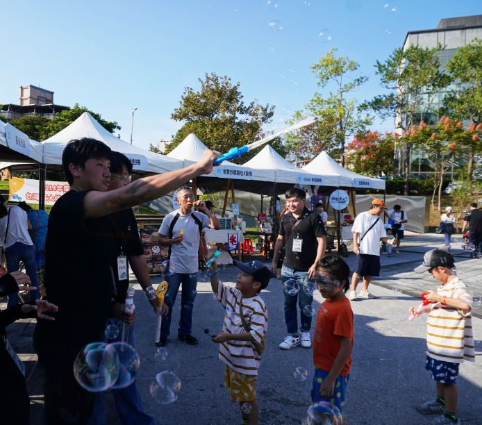 還設有在地海派市集,包括基隆精釀、安九三肉桂捲、博勝行、山水草間等伴手禮及美食廠商齊聚,還找來一隻凱迪等在地歌手進行駐唱演出,另外還有泡泡秀等活動,相當熱鬧。