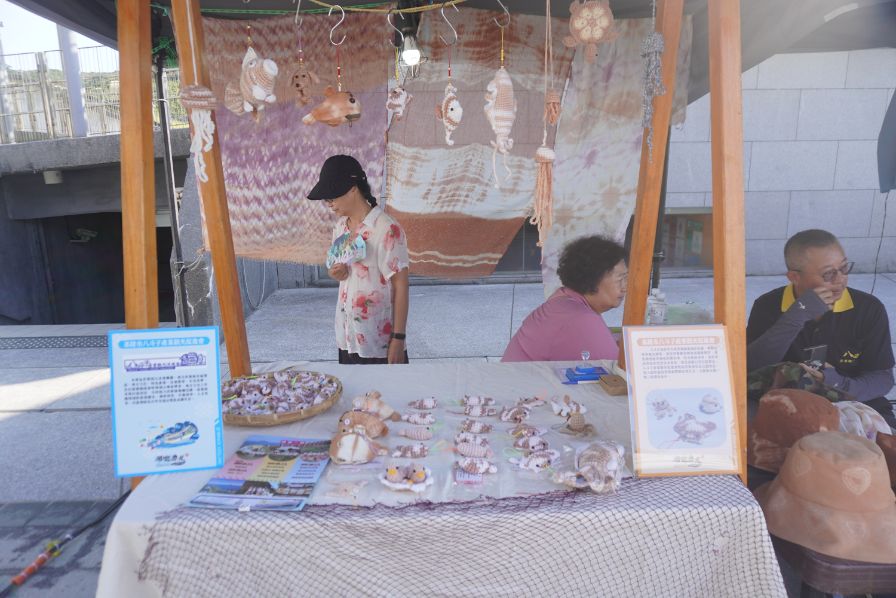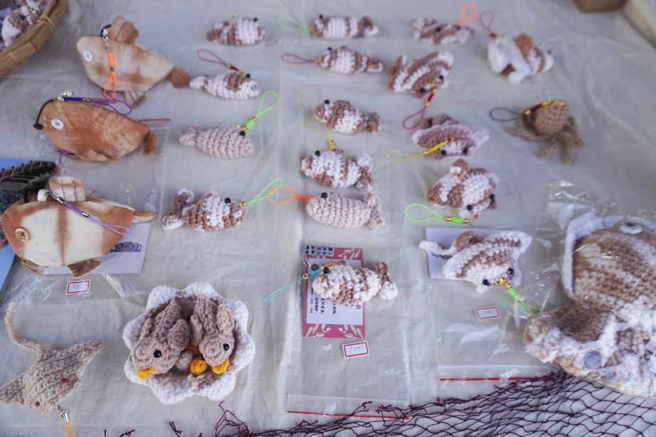 提供以薯榔染製作的各種文創商品,以繩子綑綁成小魚,經過薯榔染後,造型相當可愛。