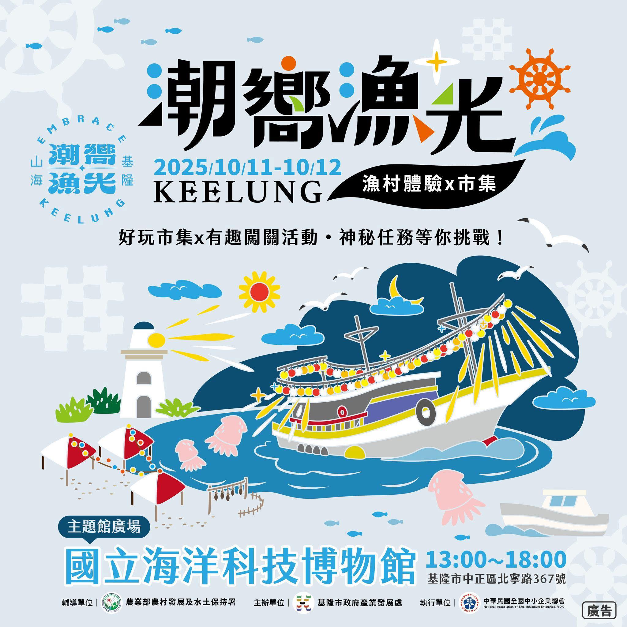由基隆市政府產業發展處舉辦的潮嚮八斗漁光市集於10/11、10/12在海科館主題館前方廣場舉辦,現場除了規劃有沉浸式展覽,可以深入了解海洋漁村文化跟永續精神。