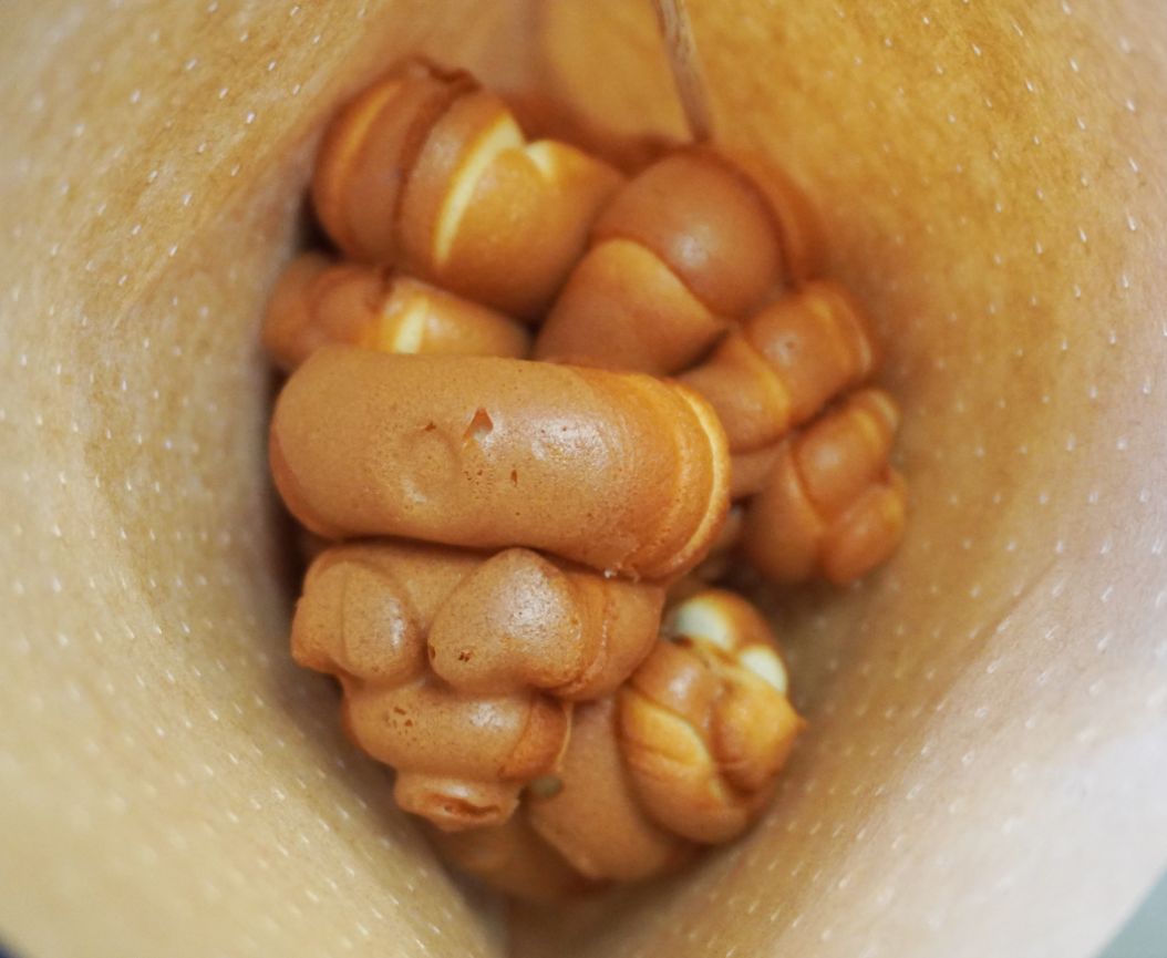 基隆市集活動常出現的美食攤位,雞蛋糕選用新鮮雞蛋、日本上白糖、鮮奶及麵粉進行製作,完全不加一滴水,手工拌打,吃起來帶有濃郁麵粉香,內餡濃郁,非常好吃。