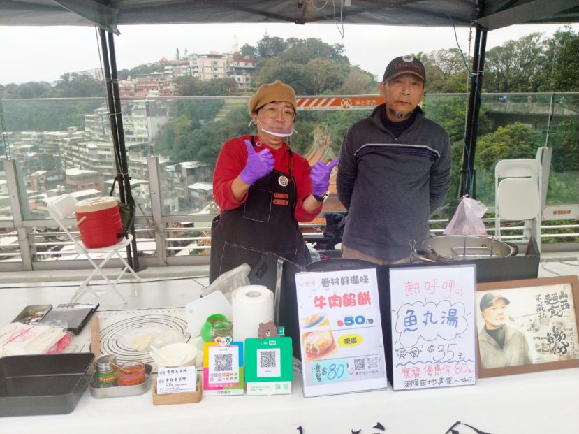 由一對夫妻經營,留著山羊鬍的施老闆,從山西老師傅傳承一身好手藝,現場販售牛肉餡餅跟魚丸湯。