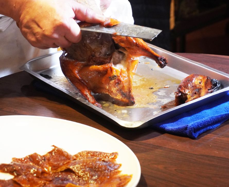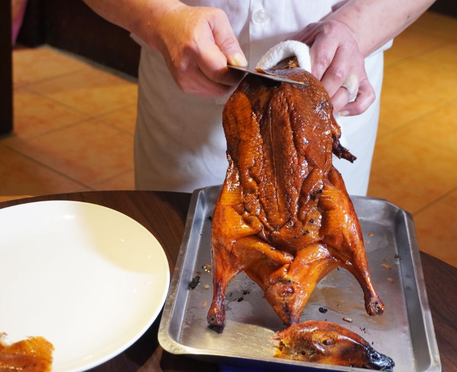芙蓉園中餐廳的主廚擁有超過三十年的料理經驗,曾於知名北方料理餐館任職,北京烤鴨是店內招牌,主廚手法俐落,將鴨皮跟鴨肉分開,片成薄如紙片的片狀,入口即化,搭配蔥段、黃瓜、甜麵醬與餅皮,口感層次立刻展現。