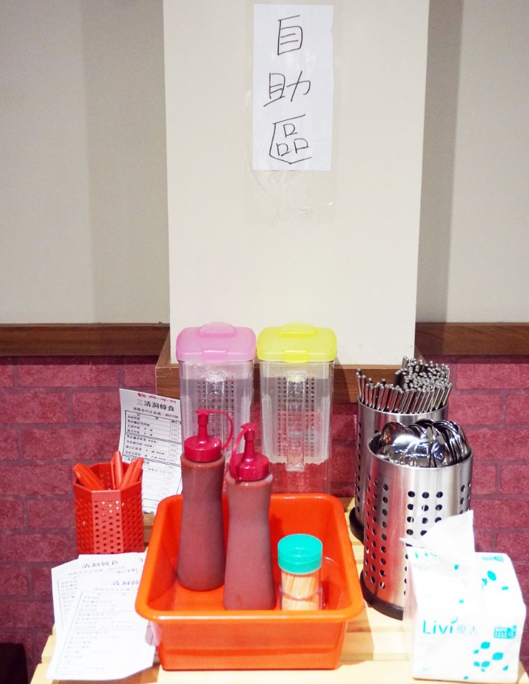 右後方設有醬料區,兩側有多張4人座座位,入口右側的冰箱內,擺放各種韓式飲料。