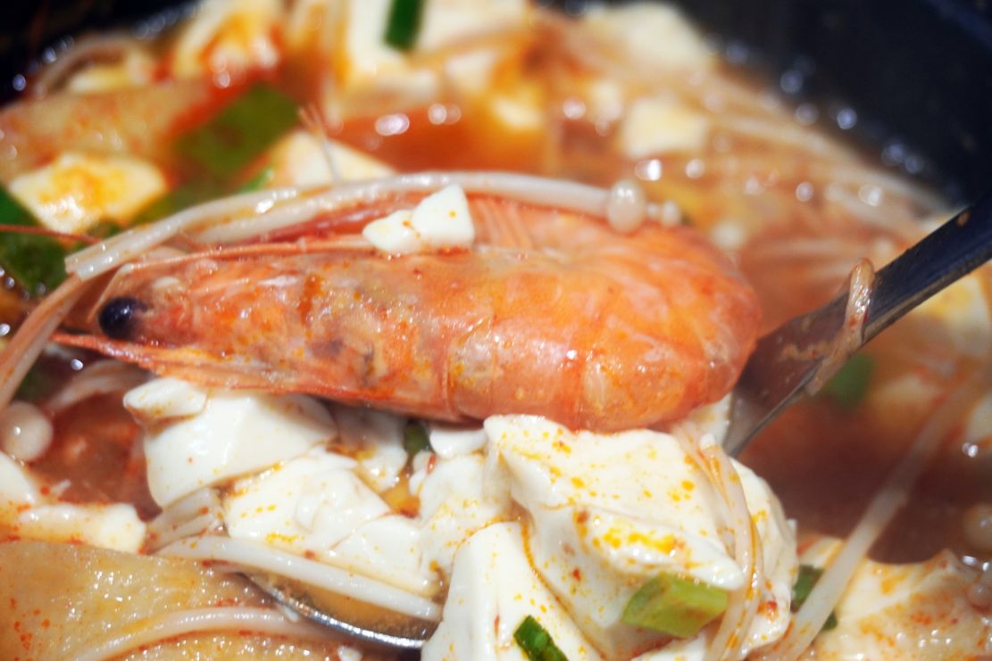用湯匙一挖。除了滿滿的滑嫩豆腐,還有肉片跟鮮蝦,加了辣醬的湯頭,喝起來滋味香辣。