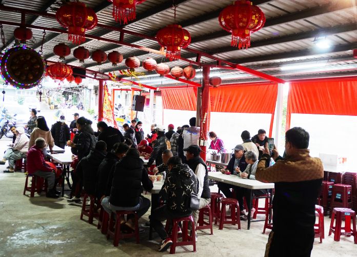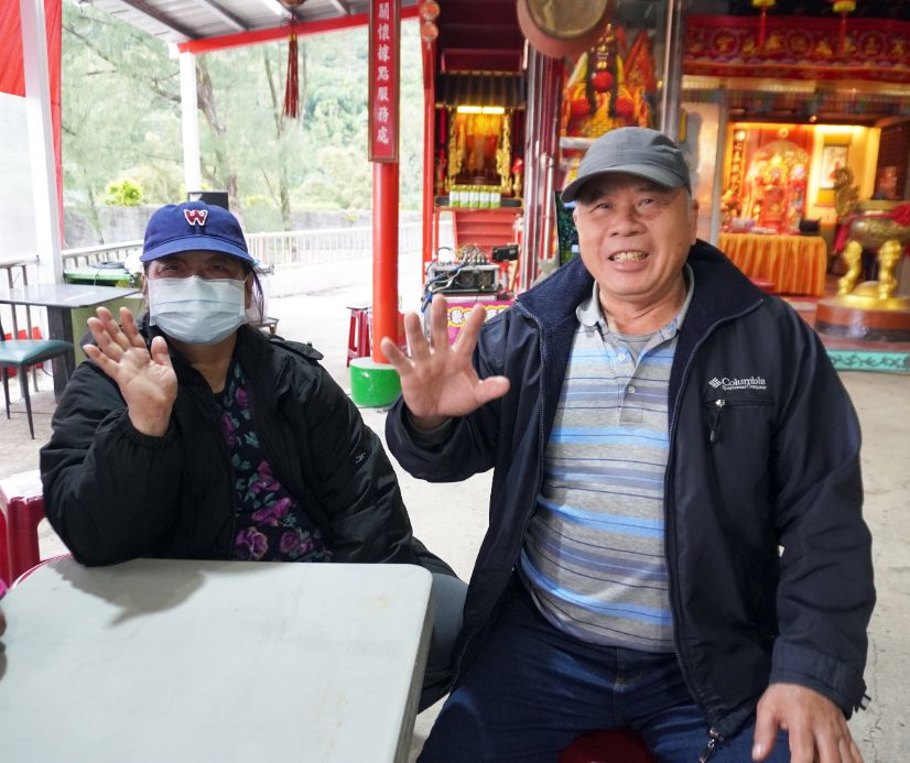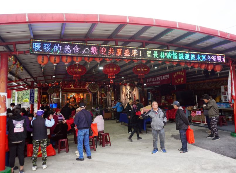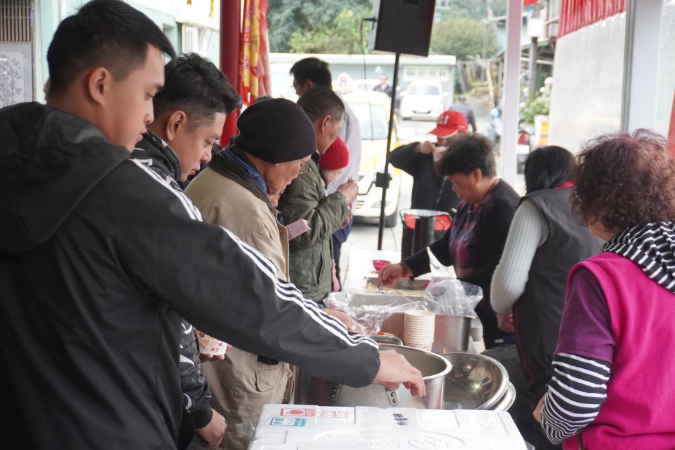在廟埕右側領取外套後,里民跟長者們也紛紛來到廟埕左側的長桌用餐。