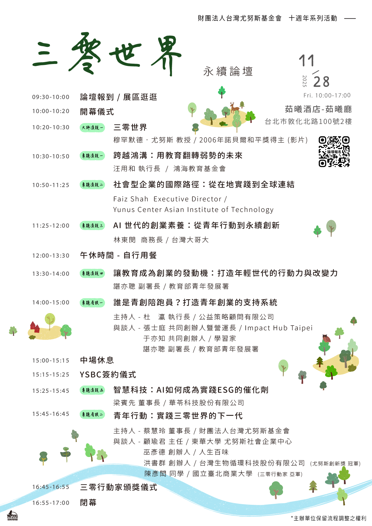 「三零世界:永續論壇」將由諾貝爾和平獎得主暨孟加拉臨時政府暨台灣尤努斯基金會首席顧問—穆罕默德‧尤努斯教授,以《三零世界》為題的大師演說(線上或影片)揭序,「三零世界:永續論壇」為了聚焦於青年創業與科技運用的重點,邀請專業主講貴賓包括鴻海教育基金會執行長汪用和、亞洲理工學院尤努斯社會企業中心執行長Faiz Shah博士、台灣大哥大股份有限公司商務長林東閔、教育部青年發展署副署長諶亦聰、華苓科技董事長兼總經理梁賓先。
